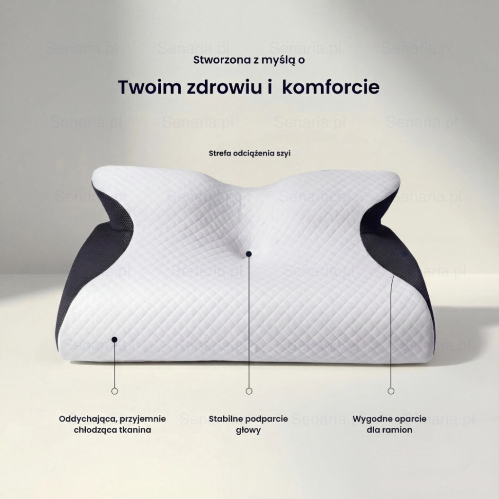 To nie problem organizmu — to brak właściwego ułożenia głowy, szyi i kręgosłupa podczas snu. Zwykłe poduszki nie dopasowują się do naturalnej krzywizny karku, przez co mięśnie pozostają napięte przez całą noc, zamiast się regenerować.